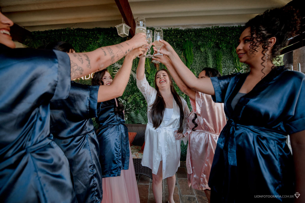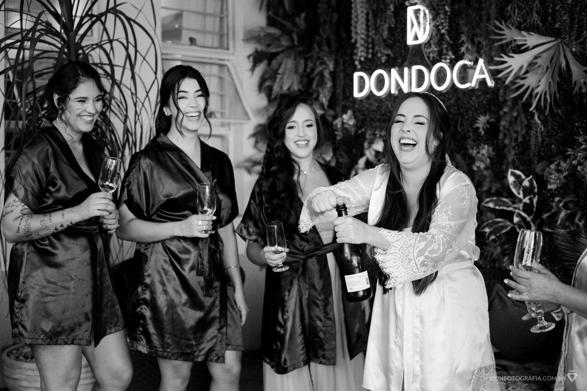 O dia começou no salão Dondoca, onde Priscila se preparou ao lado de suas amigas e madrinhas. Foi um momento cheio de risadas e cumplicidade, e fiz questão de registrar cada detalhe. A pedido da noiva, organizei o emocionante "first-look" das madrinhas ao vê-la com sua make pronta e para realizar um brinde, um instante repleto de alegria e surpresa.