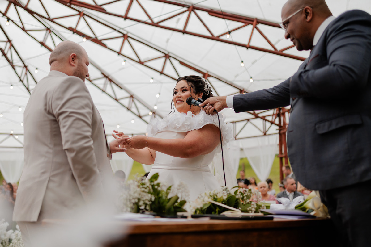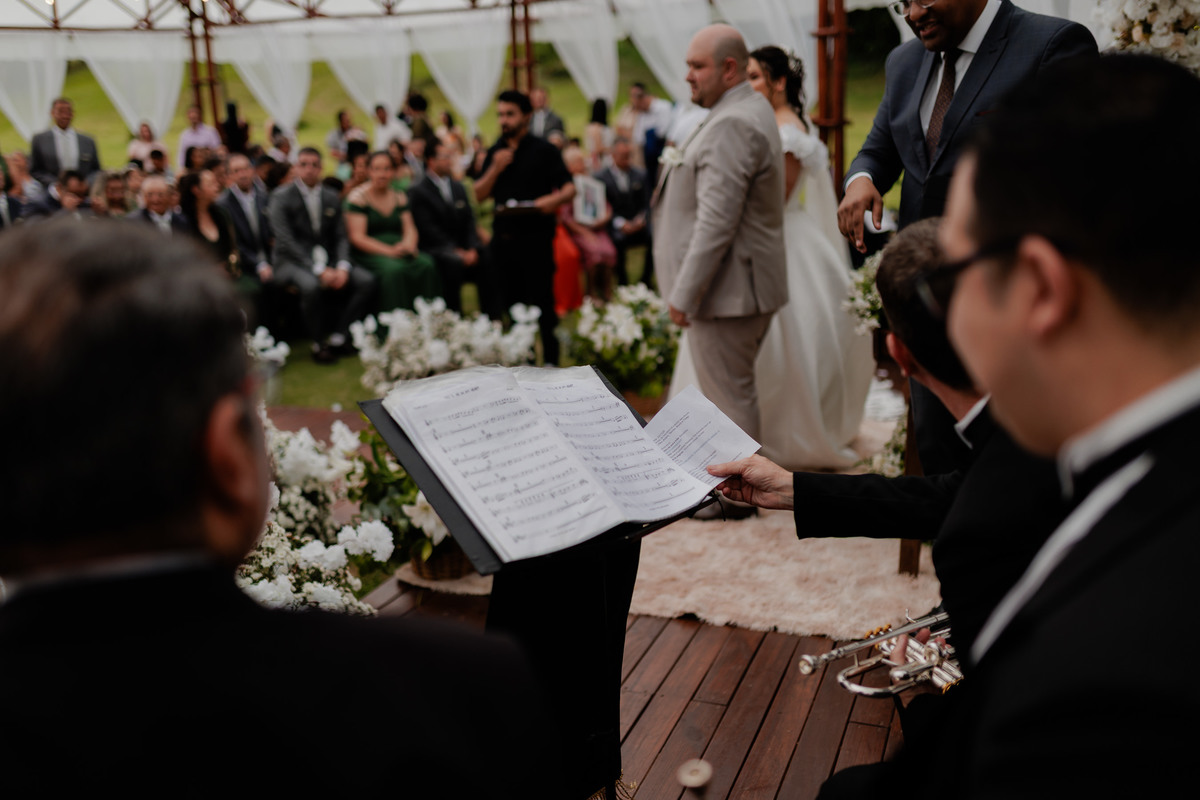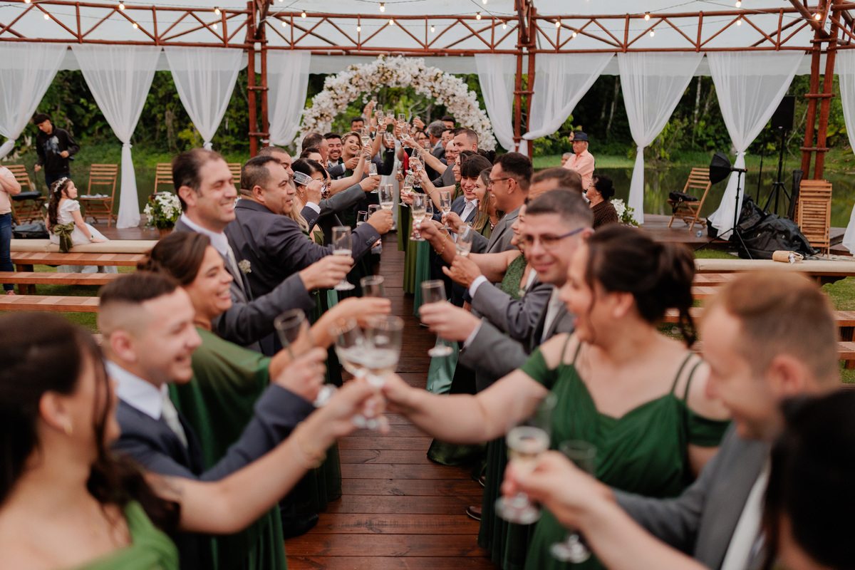 A cerimônia e a festa aconteceram no mesmo sítio, permitindo que os convidados vivessem uma experiência completa no campo. A luz natural, o clima leve e a natureza que abraça o espaço transformaram o dia em uma memória inesquecível para todos presentes.