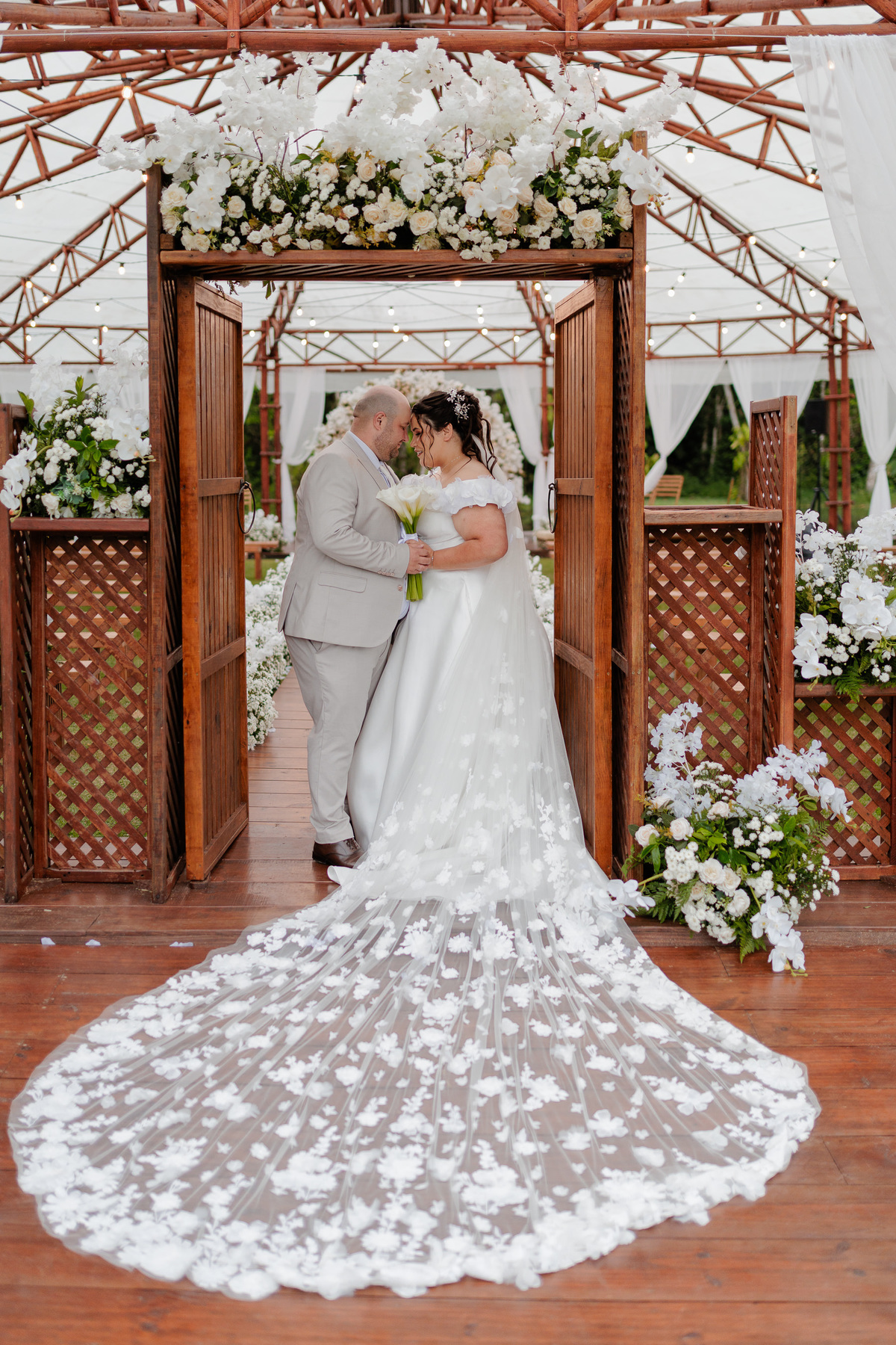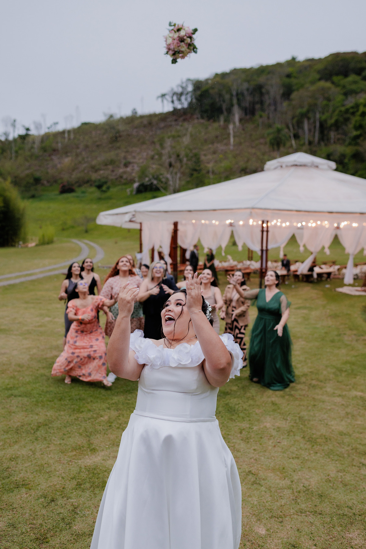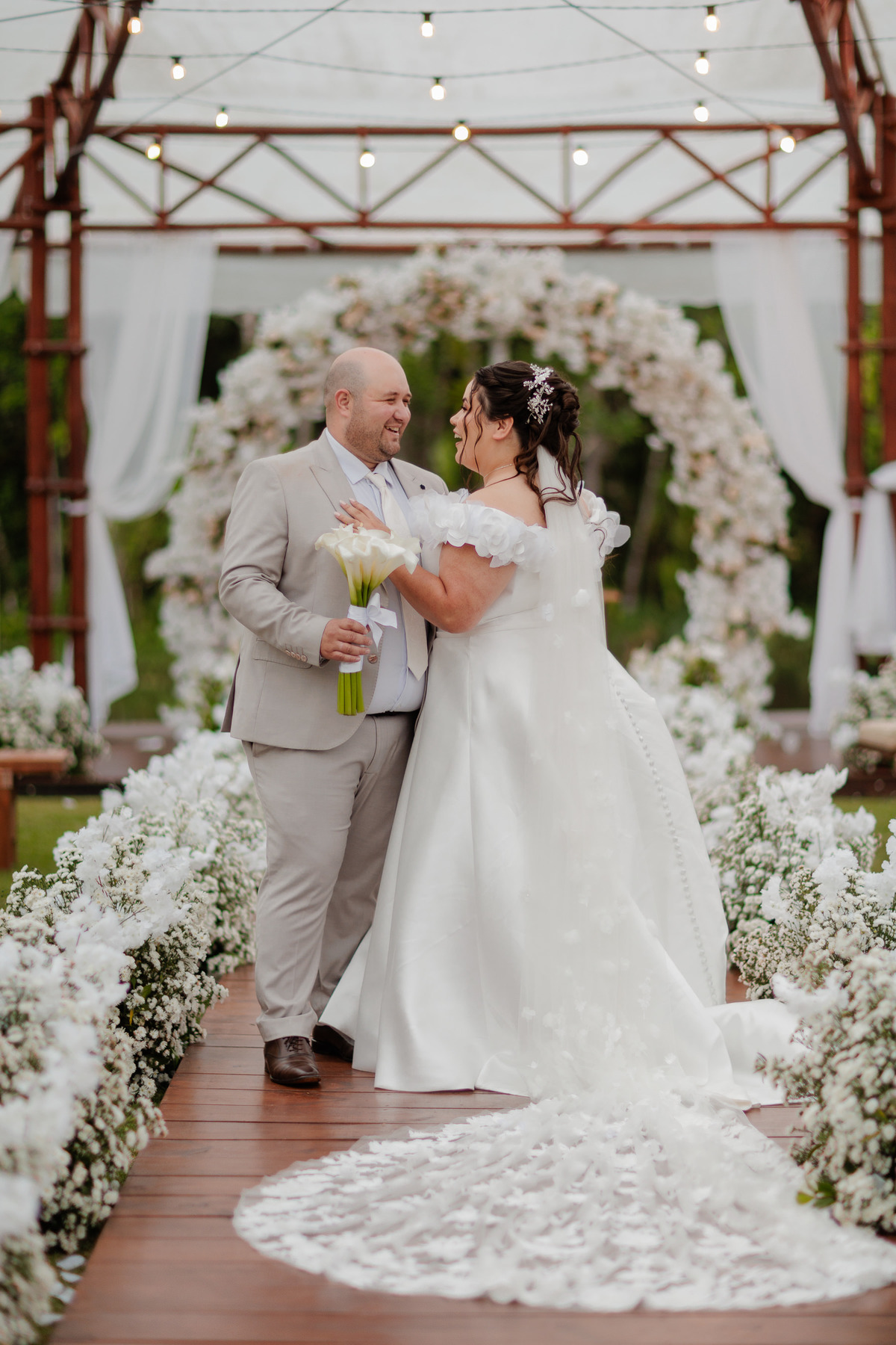 A cerimônia e a festa aconteceram no mesmo sítio, permitindo que os convidados vivessem uma experiência completa no campo. A luz natural, o clima leve e a natureza que abraça o espaço transformaram o dia em uma memória inesquecível para todos presentes.